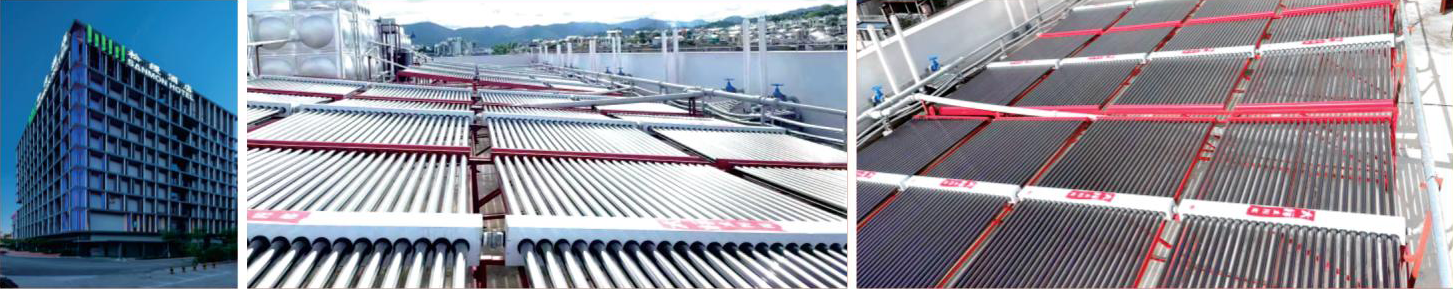 系統(tǒng)概述:安裝真空管集熱器2000管,集熱面積260㎡,系統(tǒng)配置30匹空氣源熱泵輔助系統(tǒng)運(yùn)行